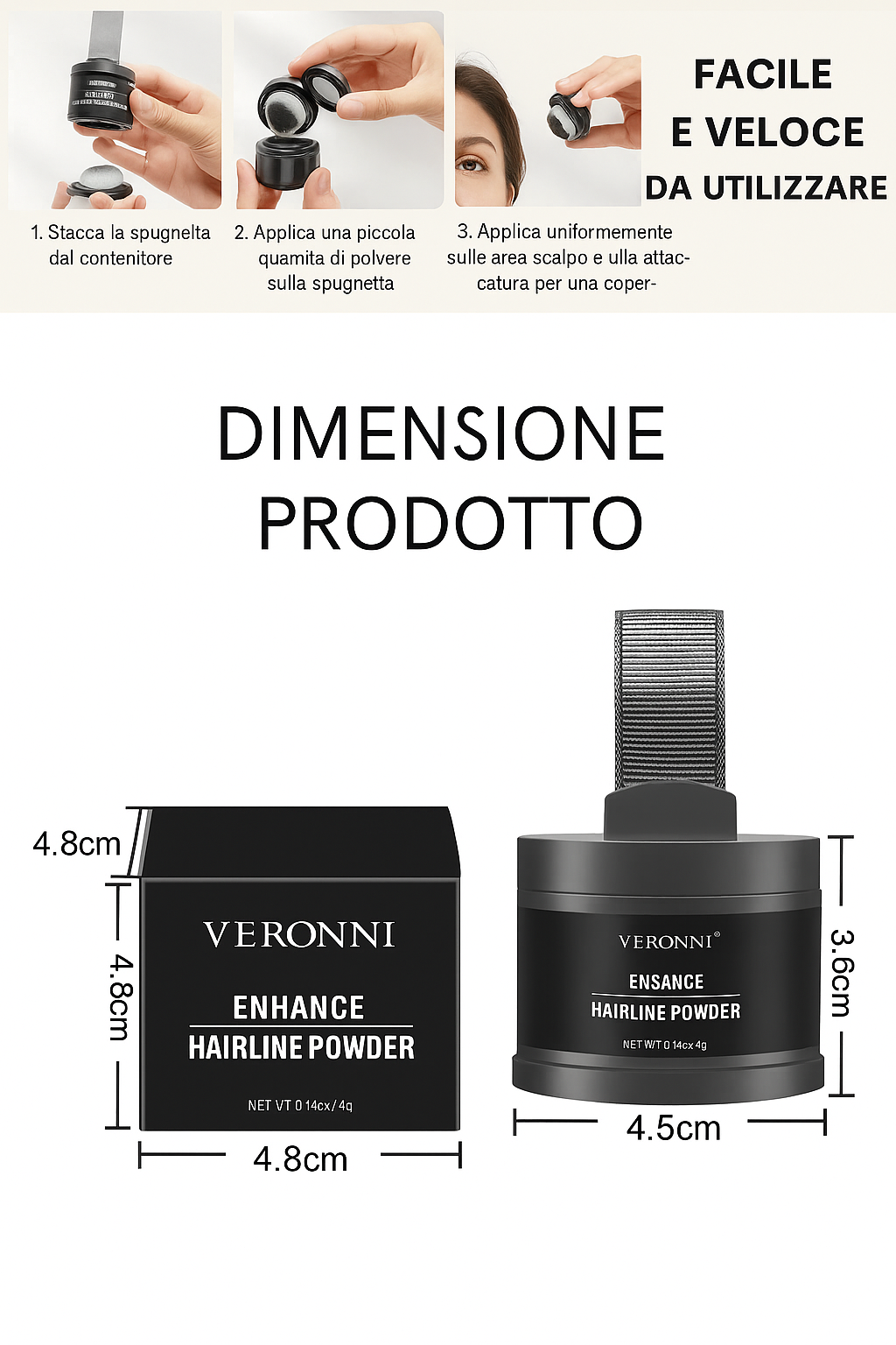 Hairline Powder è il correttore istantaneo che copre diradamento, ricrescita e attaccatura in soli 10 secondi.Niente più attese. Niente più imbarazzo. Solo capelli dall'aspetto pieno e naturale.